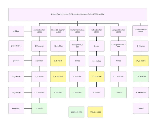 4Cs have an average of 35cM, so I looked for matches at this level who were not also matching a Scottish Buchan (ie a descendant of siblings of Robert b1813.) I have looked so far in Pat G, Kath J, Vicki A, myself and my siblings.